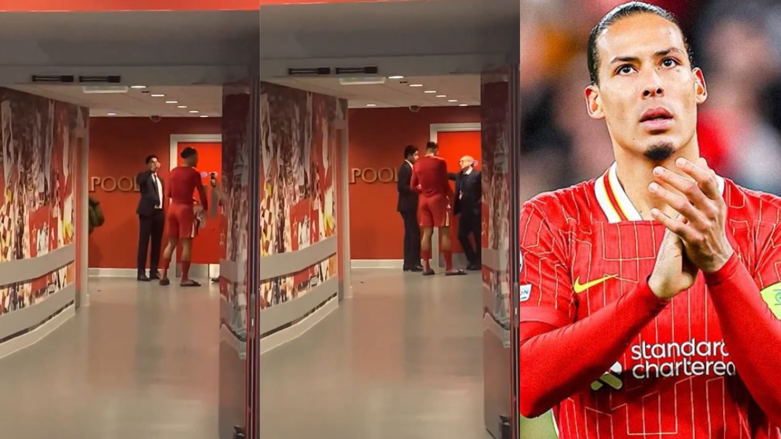 Liverpool skipper Virgil van Dijk (33) has a post-game talk with PSG president Nasser Al-Khelaifi and Sporting director Luis Campos at Anfield.pic.twitter.com/aWDN3hl0Om